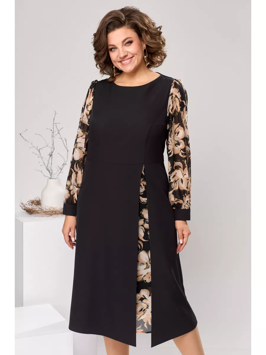 - Najważniejsze szczegóły : Subtelny kwiatowy wzór na siateczkowych rękawach dodaje delikatności tej całkowicie czarnej sukience; długość midi (ok. 105–109 cm) zakrywa łydkę, łącząc elegancję z codzienną mobilnością.