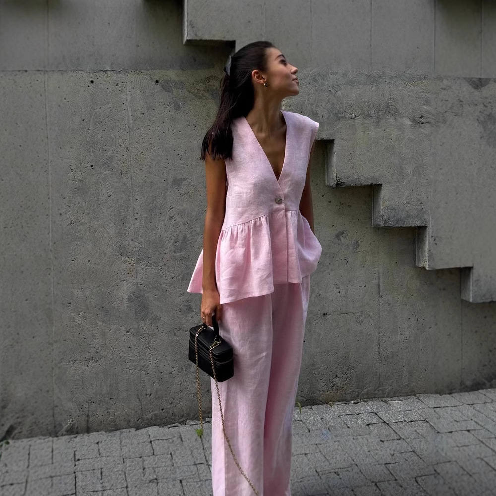 Σε συνδυασμό με ένα λινό παντελόνι με φαρδιά πόδια, αυτό το σετ προσφέρει μια χαλαρή αλλά κομψή εμφάνιση, ιδανικό για ζεστό καιρό. Το απαλό παστέλ ροζ χρώμα ενισχύει την κομψή και αβίαστη γοητεία του. Το λινό ύφασμα που αναπνέει το καθιστά ιδανικό για casual εξόδους, διακοπές ή καλοκαιρινά brunch.