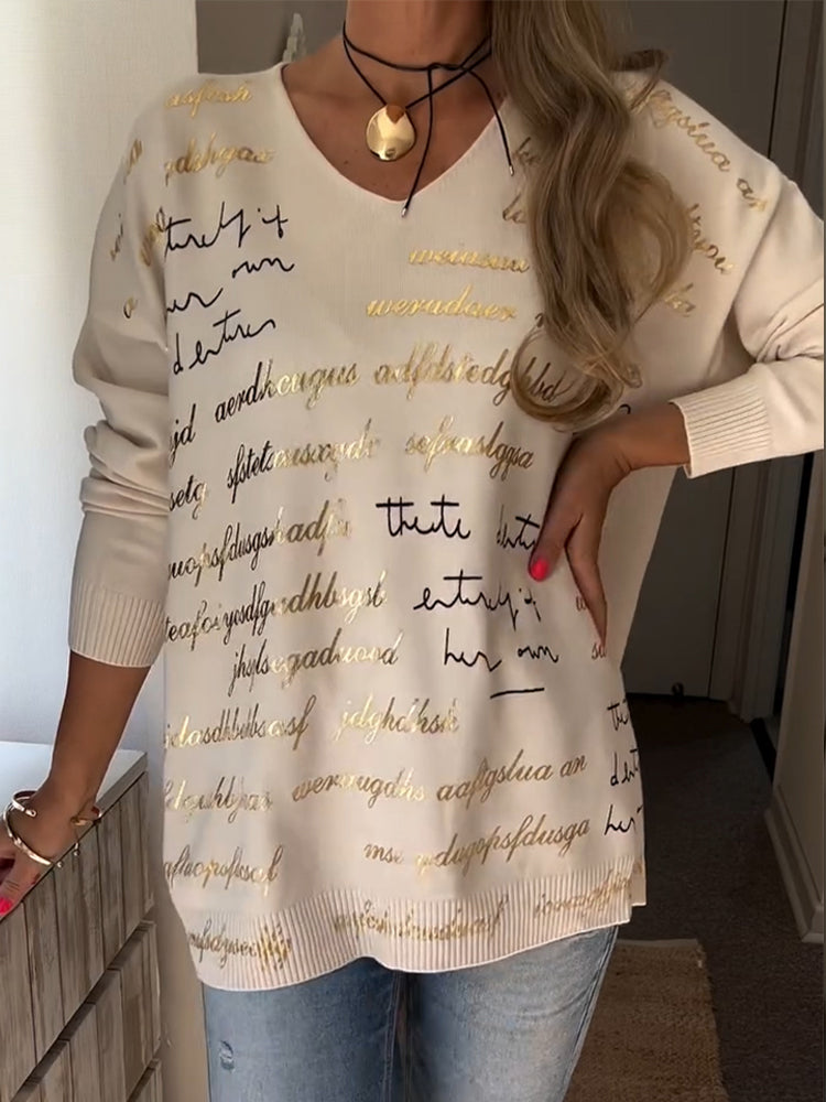 Womens V-neck Printed Letter Casual Top